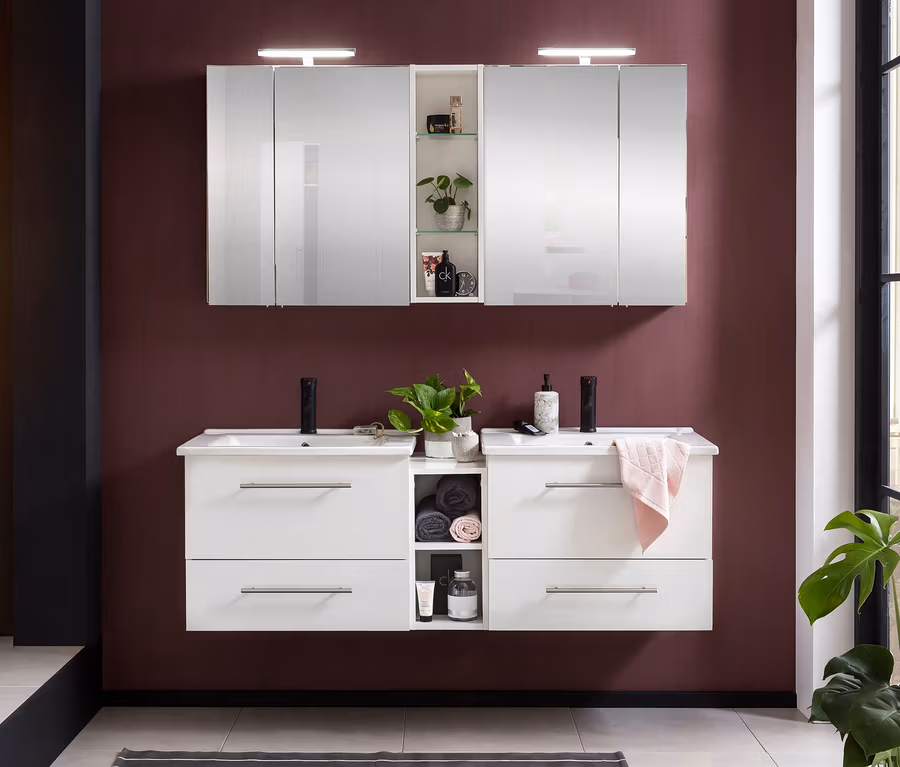 - Doppelwaschtisch inkl. Aufsatzbecken und Doppelspiegelschrank mit LED-Beleuchtung