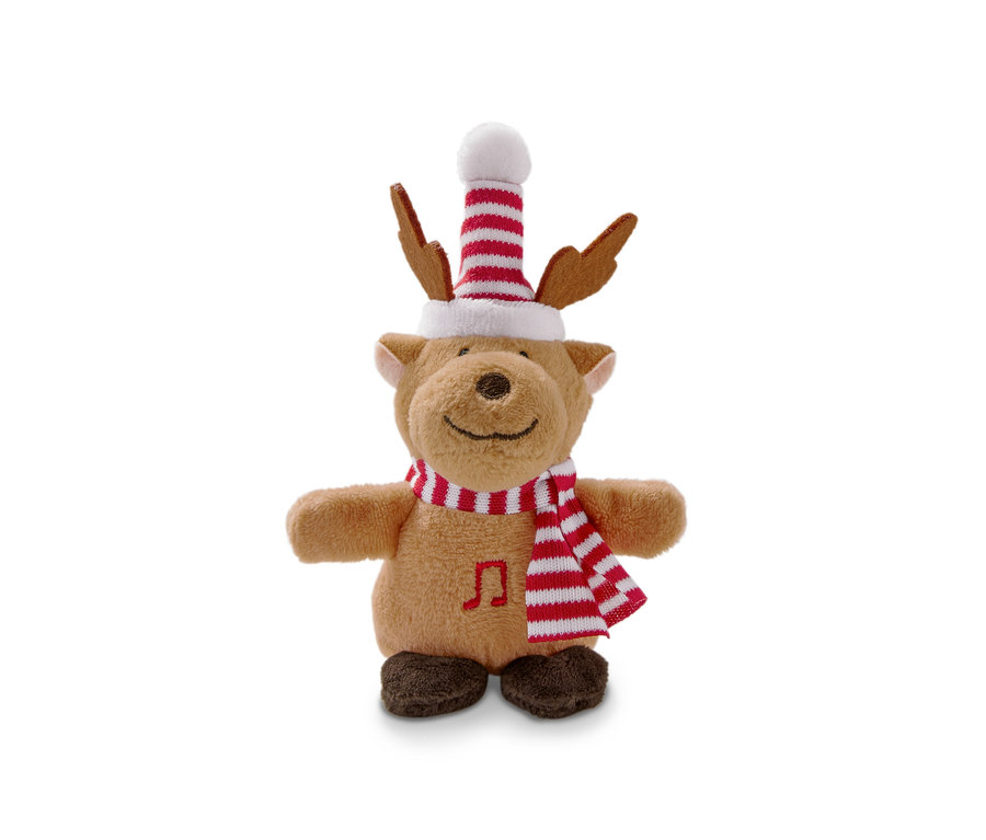 Schöne Weihnachten wünscht dieses singende Rentier. Denn sobald man seinen plüschig weichen Bauch drückt, singt es mit leuchtend roten Wangen »We wish you a merry Christmas«. Ob man sich von dem kleinen Sänger selbst entzücken lässt oder damit Freunden eine Weihnachtsfreude bereitet, ist natürlich Geschmackssache. Genauso wie die Möglichkeit, das Rentier als singenden Adventsschmuck in den Tannenbaum zu hängen.