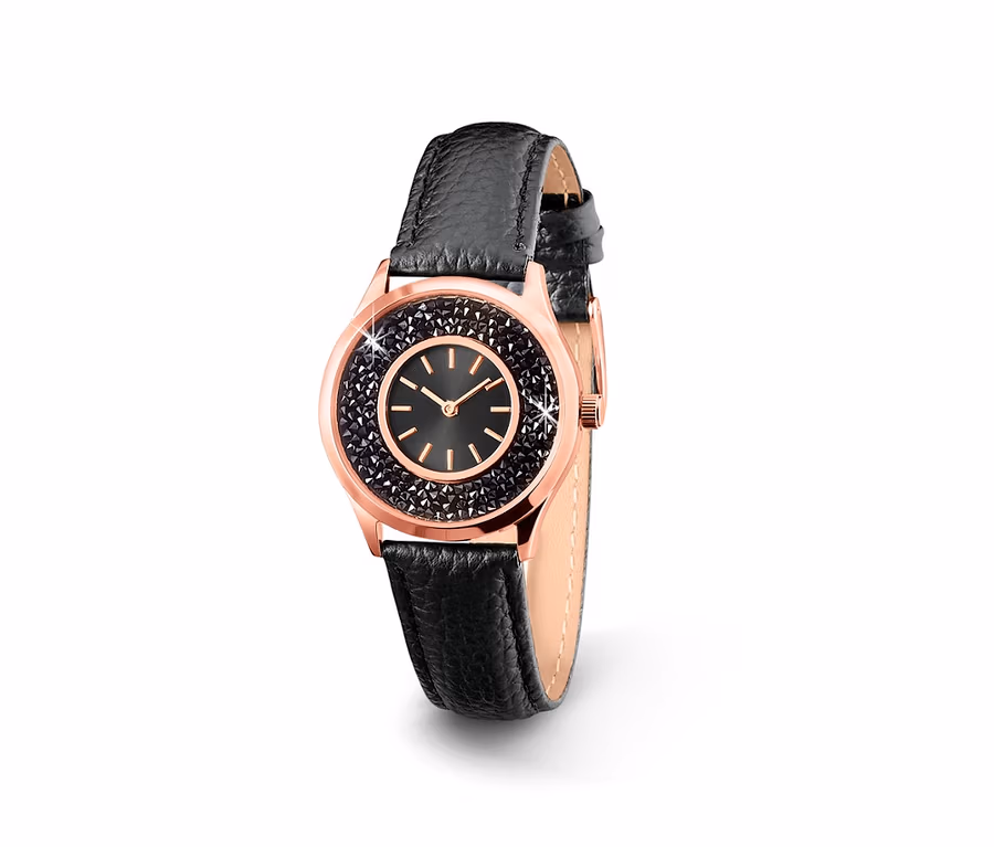 Damenuhr mit Lederarmband und Swarovski® Kristallen, schwarz