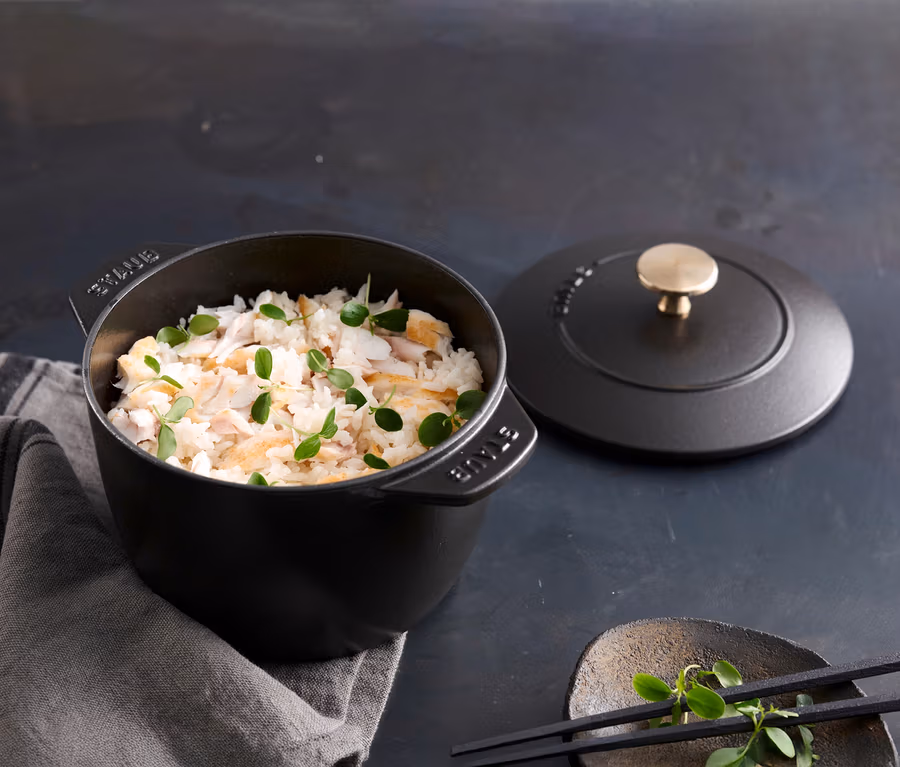 - Die gleichmäßige Wärmeverteilung von Gusseisen hilft, das Anbrennen oder Verkleben von Reis zu verhindern