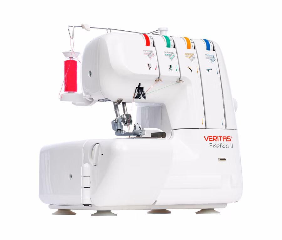 Die VERITAS Elastica II kann mit 2, 3 oder sogar 4 Fäden genutzt werden, das ermöglicht eine besonders elastische und zugleich sichere Overlock-Naht. Alle vier Fadenführungen sind dabei farblich gekennzeichnet, das macht das Einfädeln erheblich einfacher.
