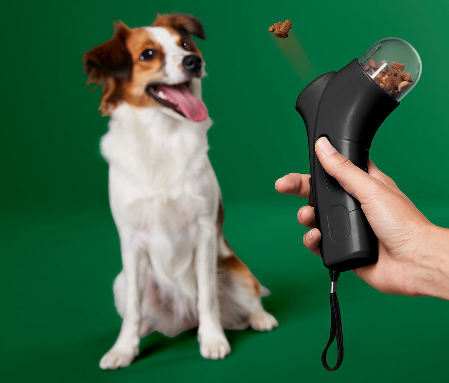 - Schießt Leckerlis bis zu 4 Meter weit