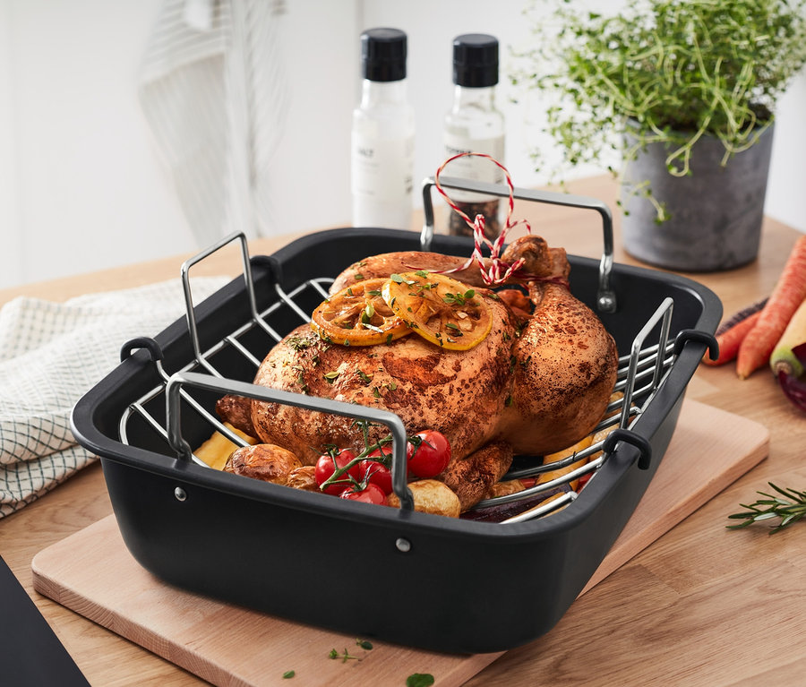 - Überdurchschnittliche Größe und hohe Seitenwände – auch ideal für z.B. Rinderbrust, Lammkeule oder Schweine-Rippchen