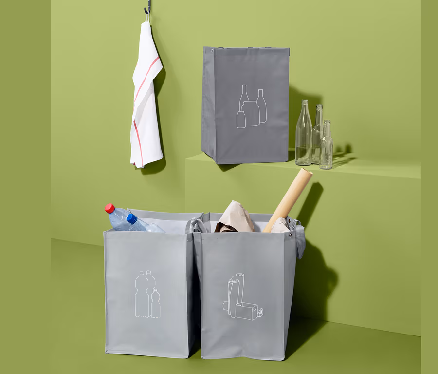 Mülltrennung leicht gemacht: Mit diesen Taschen gelingt das Zuordnen von Papier, Glas und Plastik ganz einfach. Der Grund dafür sind feine kleine Zeichnungen, die sich auf den Sortiertaschen befinden und anzeigen, welches recycelbare Material in der jeweiligen Tasche gesammelt wird.