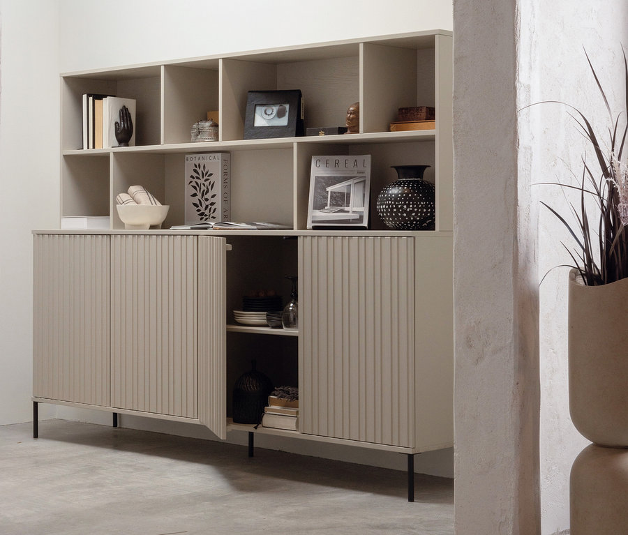 • Fächerschrank aus staubfarben lackiertem Kiefernholz mit viel Stauraum hinter 4 Relieftüren