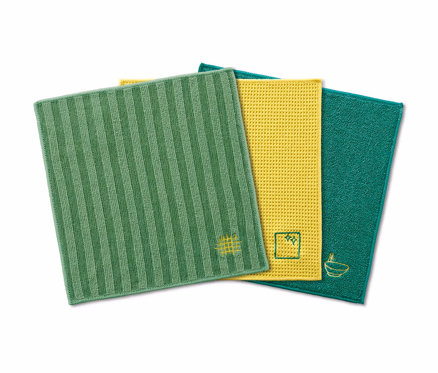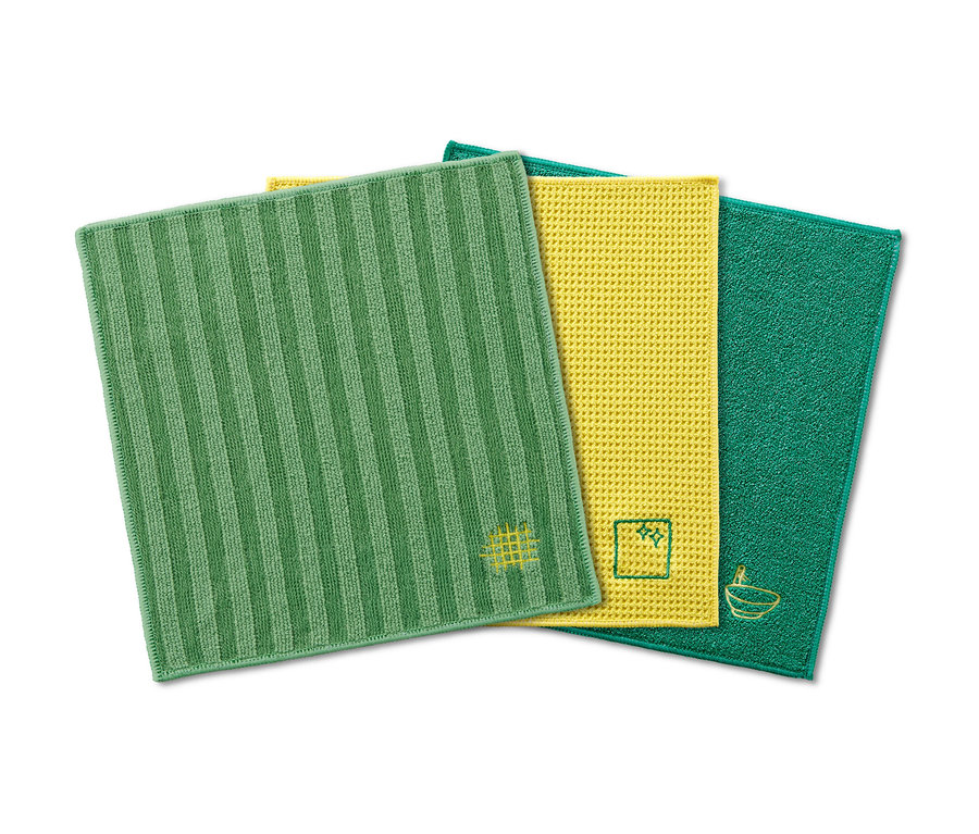 Mit diesen hier kommt Sauberkeit auf. Diese drei Spezial-Reinigungstücher bieten in Küche und Bad für jede Oberfläche das richtige Tuch. Sie sind durch den Microfaser-Anteil besonders langlebig, fusselfrei sowie saugstark und lassen sich dank der eingestickten Logos ausgesprochen leicht unterscheiden.