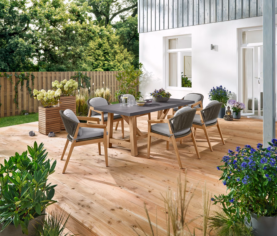 - Tischplatte aus witterungsbeständigem, pflegeleichtem Polyzement
