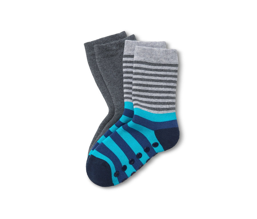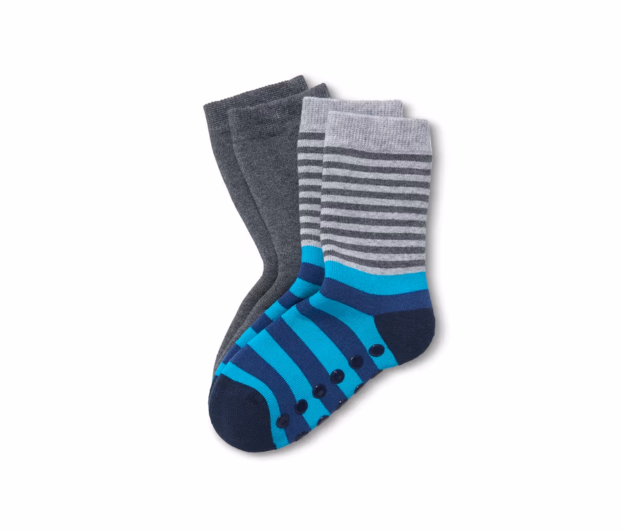 Diese Thermosocken für Kinder sorgen dafür, dass die kleinen Füße beim Toben durch die Wohnung nicht auskühlen. Die Söckchen sind an den Spitzen und den Fersen verstärkt und an der Sohle mit Antirutsch-Noppen versehen, damit man auch auf glatteren Böden nicht ins Rutschen kommt.