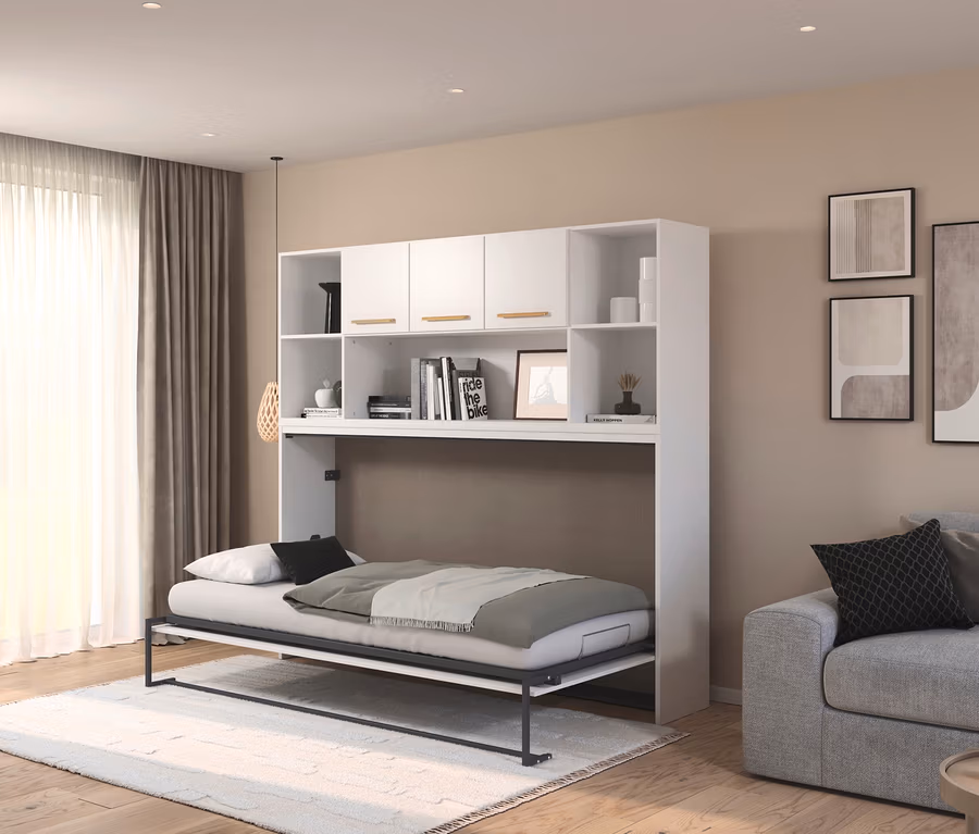 - Regelelemente über dem Bett bieten zusätzlichen Stauraum