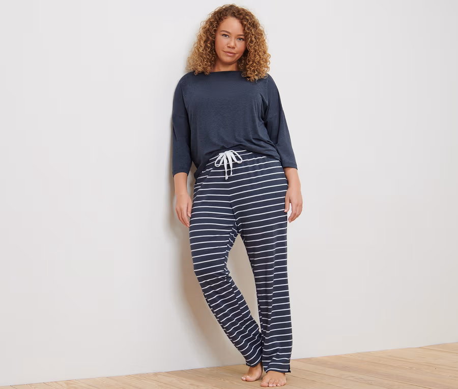 - Dieser Pyjama beinhaltet Fasern aus nachhaltigem Holz.