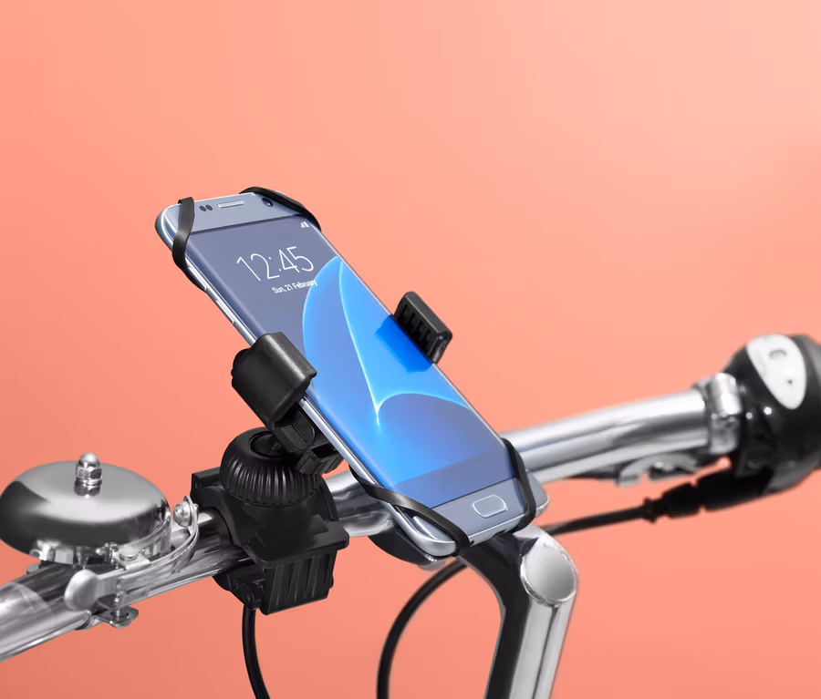 Das Handy sitzt geschützt in dem gepolsterten Halter, die gummierte Klemme und das zusätzliche Silikonband sorgen dabei für einen besonders starken Halt. Die Halterung ist für alle gängigen Smartphone-Modelle mit einer Breite zwischen circa 55 und 80 Millimetern geeignet – mit oder ohne Hülle. Das Kugelgelenk lässt sich für einen optimalen Blickwinkel um 360° rotieren.