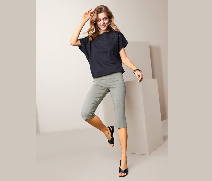 Auch im Sommer haben wir es gerne schick – und gleichzeitig bequem. Diese Stretchhose ist dabei die perfekte Basis für jedes Freizeitoutfit und mit ihrer 3/4-Länge ist sie ideal geeignet für sommerliche Tage. Die Damenhose liegt mit ihrer elastischen Qualität mit einem hohen Anteil an nachhaltiger Viskose jederzeit angenehm auf der Haut, Elasthan sorgt gleichzeitig für Formbeständigkeit und hohen Tragekomfort bei jeder Bewegung. Die Hose ist mit schmalem Bein geschnitten und hat Seitenschlitze am Saum. Ihr Bund ist elastisch und garantiert einen perfekten Sitz – natürlich ohne dabei einzuschnüren.