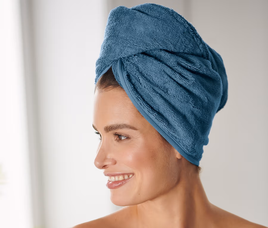 - Dieses Turban-Handtuch schützt Wasserressourcen.