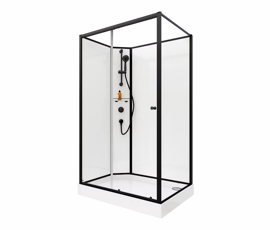 - Inkl. Duschkabine mit Rückwänden, Duschwanne mit Schürze und Ablauf sowie Armatur mit Einhebelmischer