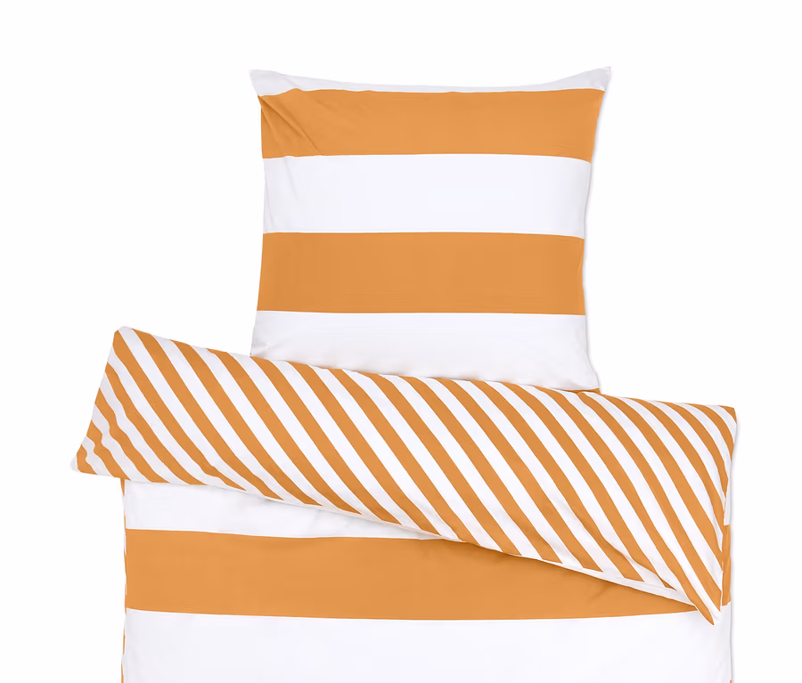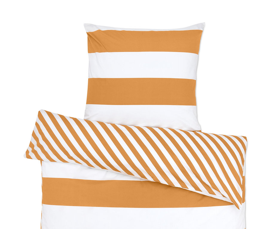 Wenn wir uns den Tag über wohlfühlen wollen, müssen wir zunächst mal dafür sorgen, dass das auch in der Nacht gewährleistet ist. Und mit dieser Perkal-Wendebettwäsche aus reiner Bio-Baumwolle schafft man die idealen Bedingungen für einem erholsamen Schlaf. Die Bettwäsche ist ebenso weich wie glatt und liegt angenehm leicht auf der Haut. Mit ihrer feinen, dicht gewebten Qualität ist sie temperaturausgleichend und saugfähig und die unterschiedlich gestreiften Seiten sorgen optisch für Abwechslung. Dank Reißverschluss sind Kopfkissen und Bettdecke im Handumdrehen bezogen.