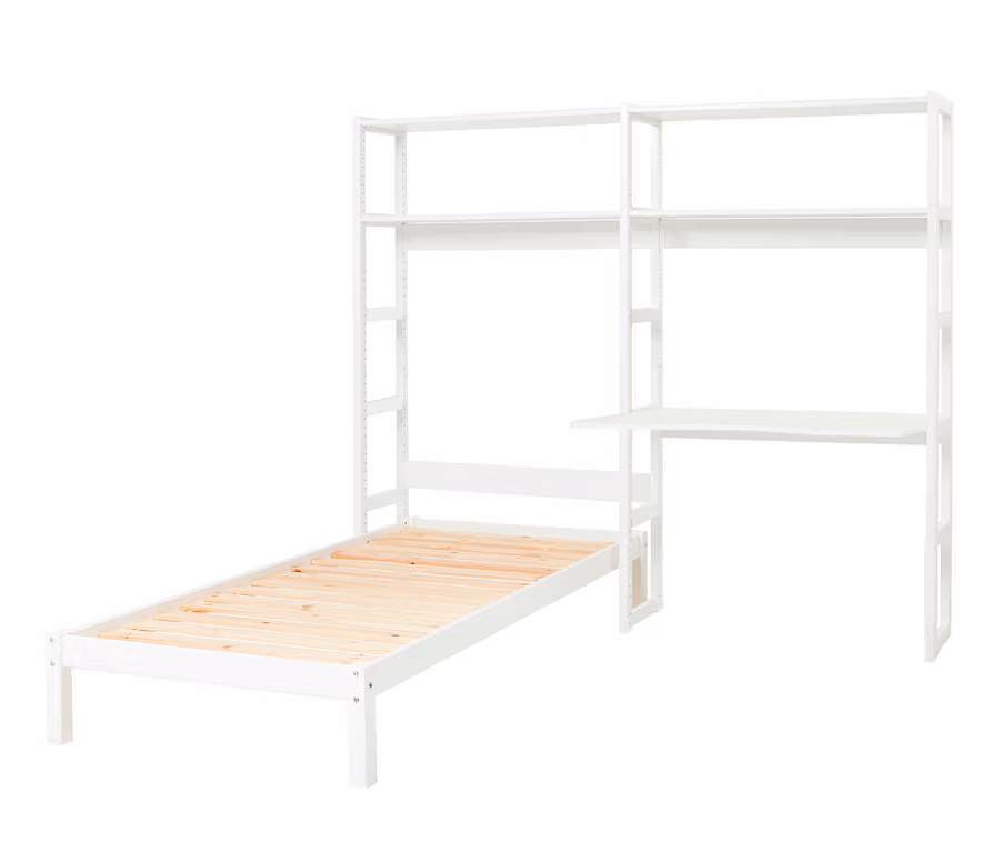 - Inkl. 3 Seitenteilen, 4 Querträgern, 4 Einlegeböden, Schreibtischplatte, Kinderbett, Montagematerial und -anleitung