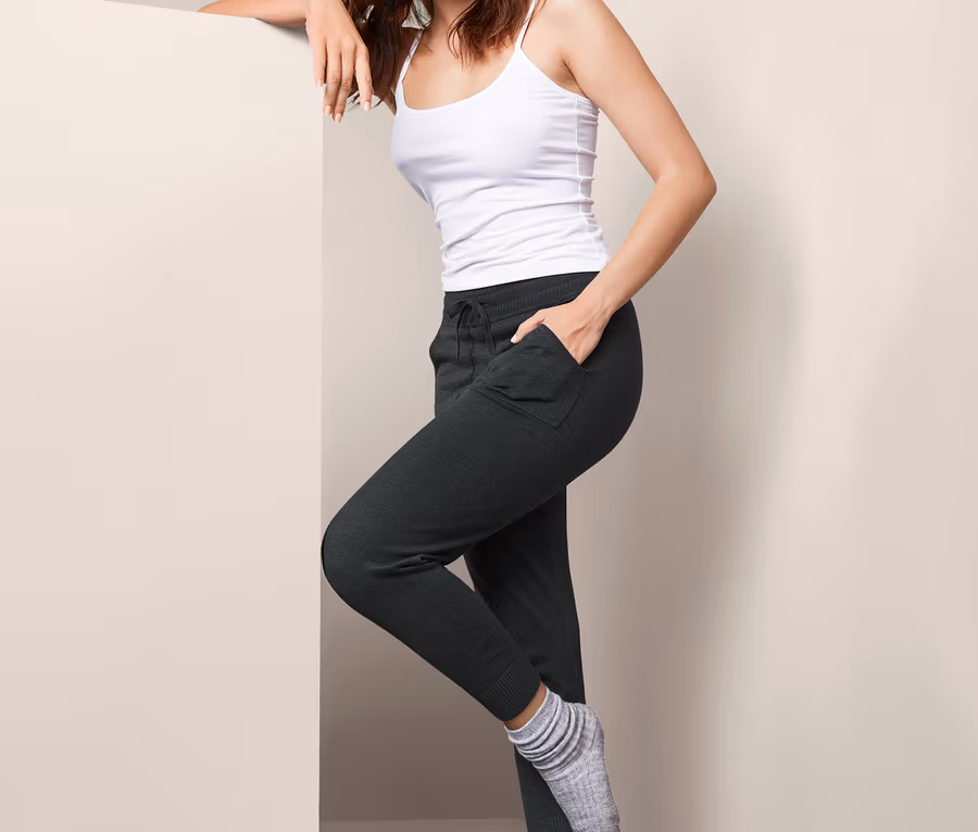 Wer es zu Hause gerne etwas gemütlicher mag, hat mit dieser Damenhose das perfekte Kleidungsstück. Sie ist von kuschelig weicher Qualität und durch Viskose ist der Stoff weich fließend. Der breite, elastische Bund sorgt für einen hohen Tragekomfort und bei Bedarf kann die Hose mit einem Bindeband fixiert werden. Die neue Lieblingjogginghose ist mit zwei Taschen ausgestattet und hat Bündchen an den Beinabschlüssen.
