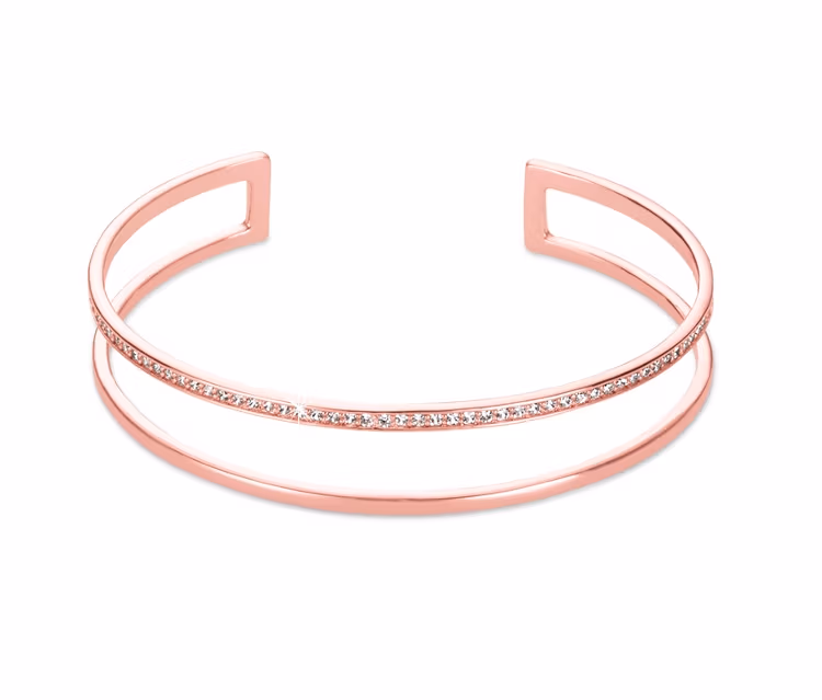 Dieser Armreif lässt Damenherzen höherschlagen: Dank zwei zierlicher Spangen, die sich elegant um den Arm legen, wirkt das Schmuckstück besonders modern. Eine Reihe funkelnder Zirkonia sorgt für ein zusätzliches Strahlen, währen die Rosévergoldung des Armreifs die Spangen harmonisch verbindet. Besonders schön: Die Einheitsgröße des Armreifs sorgt dafür, dass er an jeden Arm passt.