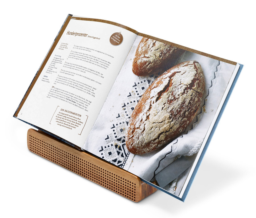 Beim Kochen muss man oft viele Dinge gleichzeitig jonglieren. Dieser Kochbuchhalter nimmt einem schon mal eine Sache ab. Auch als Halterung für Tablets und Handys eignet sich der kleine Helfer perfekt. Hierbei fungiert er auch direkt als stromloser und natürlicher Soundverstärker. Doch er kann noch mehr: Die Rückwand des Halters ist herausnehmbar und kann beim Kochen direkt als Schneide- oder Servierbrett verwendet werden. Bei Letzterem wird er durch sein hochwertiges Akazienholz mit einzigartiger Maserung auf jedem Esstisch zum Hingucker. Nachdem gekocht und geschlemmt wurde, lässt sich der Kochbuchhalter platzsparend verstauen.