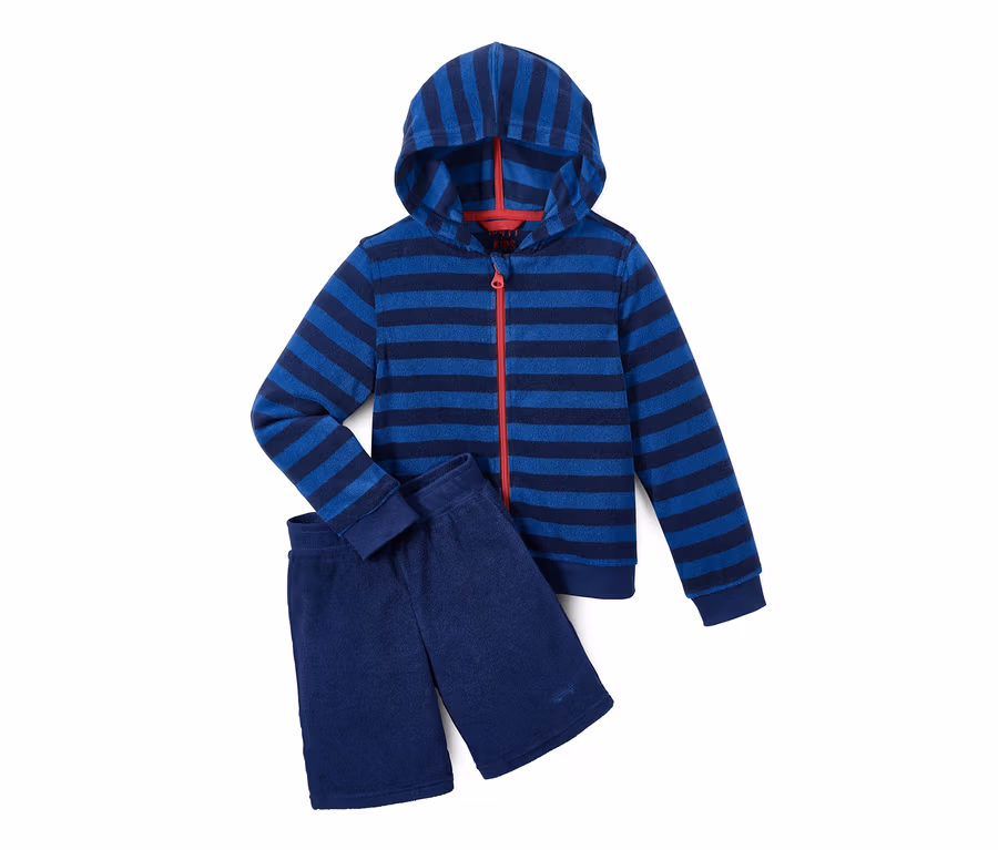 Ob die Kleinen gerade aus dem Wasser kommen oder durch den sommerlichen Garten toben – mit dieser Frottier-Kombi sind sie für jede Aktivität perfekt angezogen.