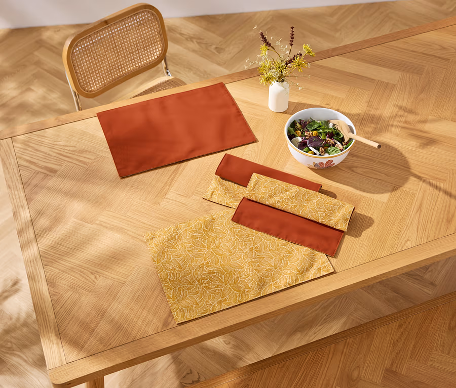 - 1 Seite gelb mit Blätter-Print, 1 Seite terrakotta