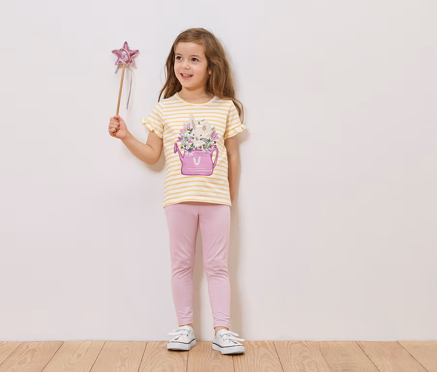 1x rapsgelb mit weißen Streifen, mehrfarbiger Hasen-Applikation und Stickerei, 1x himmelblau mit Blümchen-Alloverprint