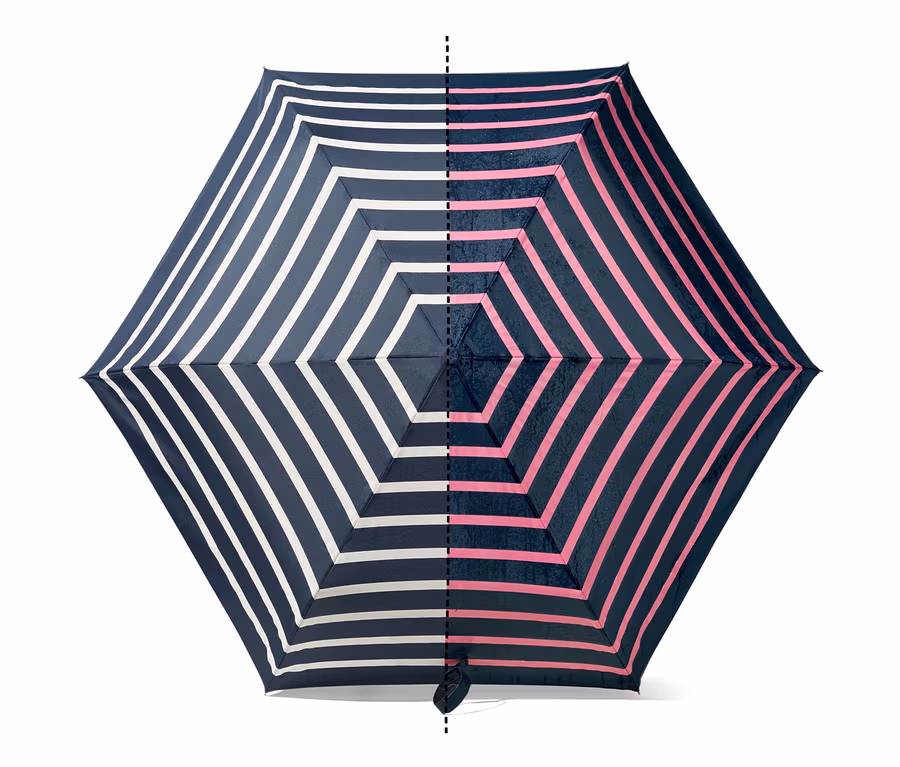 Dieser Regenschirm begrüßt den Regen mit einem farbenfrohen „Hallo“: Sobald er nass wird, wechseln die Streifen ihre Farbe von Weiß zu Pink. Der Taschenschirm hat ein stabiles Aluminiumgestänge und einen Griff mit Trageschlaufe, öffnen und schließen lässt er sich auf Knopfdruck. Und wenn der Wind es mal wieder übertreibt, lässt sich das nach außen geklappte Schirmdach problemlos wieder zurückklappen.