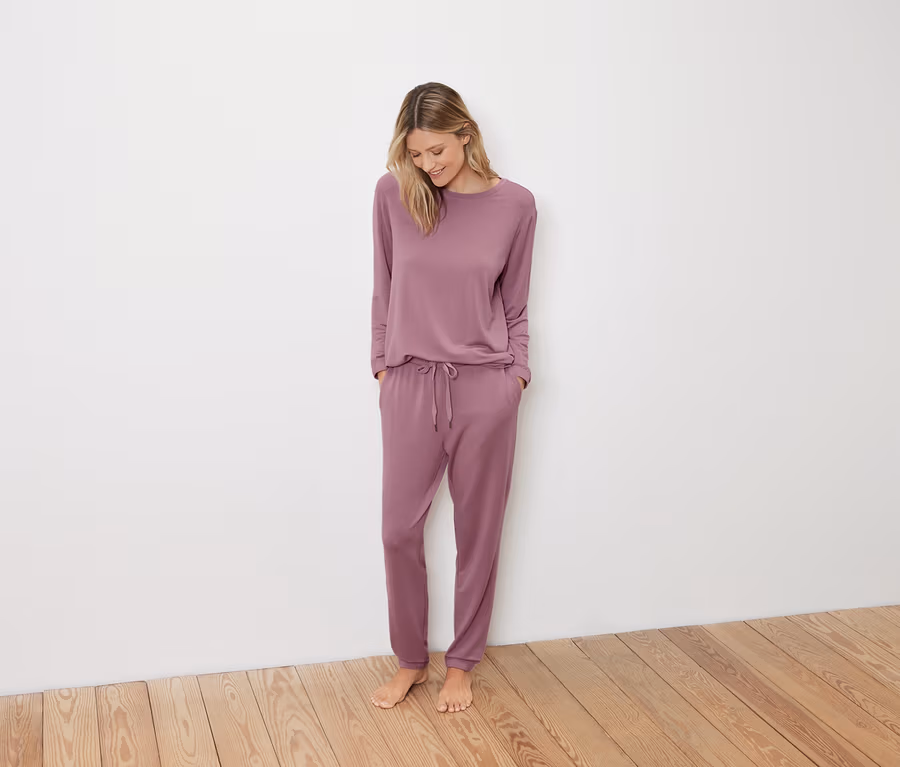 - Dieser Hausanzug beinhaltet Fasern aus nachhaltigem Holz.