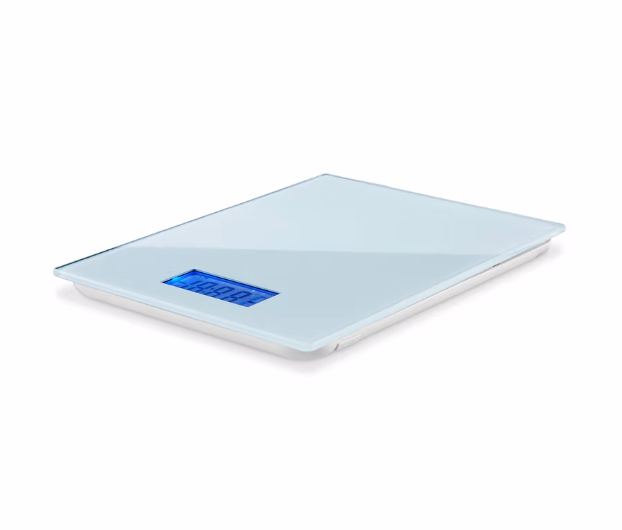 Die Waage ist besonders flach designt und mit ihren rutschhemmenden Silikonfüßen hat sie einen sicheren Stand auch auf glatten Arbeitsflächen. Das große LC-Display lässt sich gut ablesen und die Wiegefläche aus Glas ist ebenso hygienisch wir kratzfest. Nach 60 Sekunden schaltet sich die Waage ab und wenn es ihr zu viel wird, macht sie das mit einer Error-Anzeige deutlich.