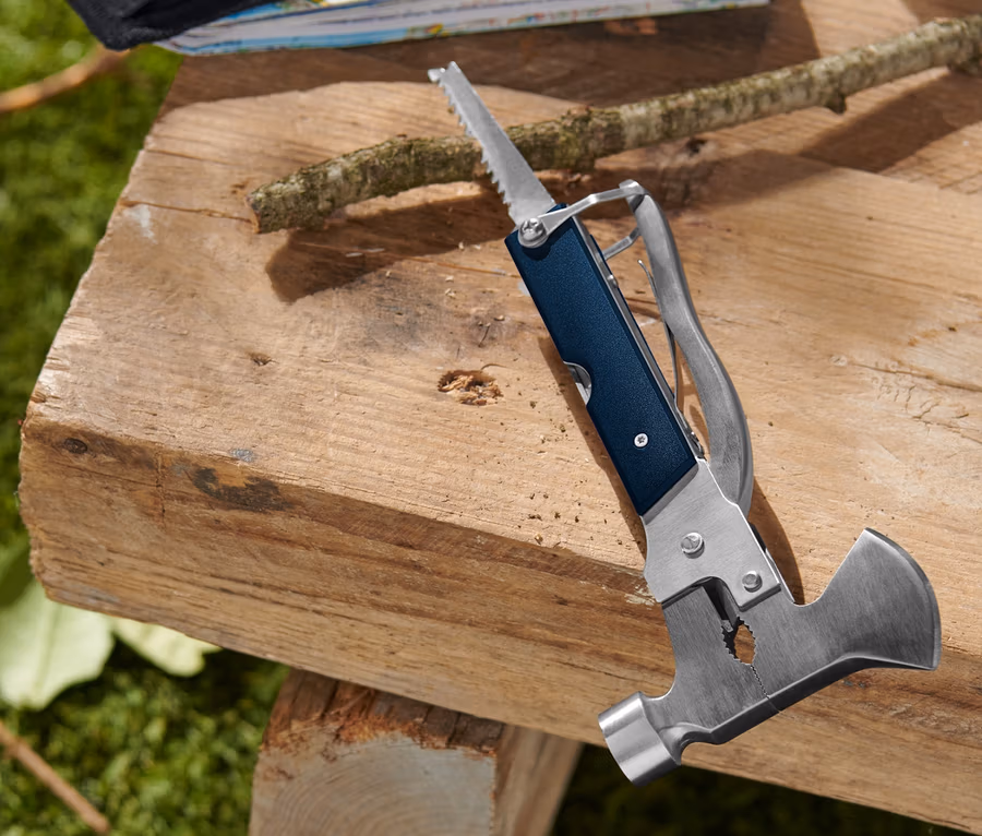 - 11 Funktionen: Axt, Hammer, Glattschliffmesser, Zange, Feile, Holzsäge, Säge, Kreuzschlitz-Schraubendreher, Schlitz-Schraubendreher, Schraubenschlüssel – 6, 7, 8, 10 mm und Flaschenöffner
