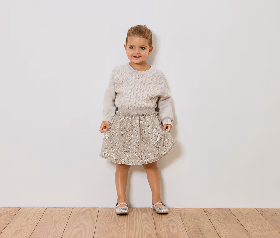 - Cremeweiß mit silberfarbenen Pailletten und Bündchen