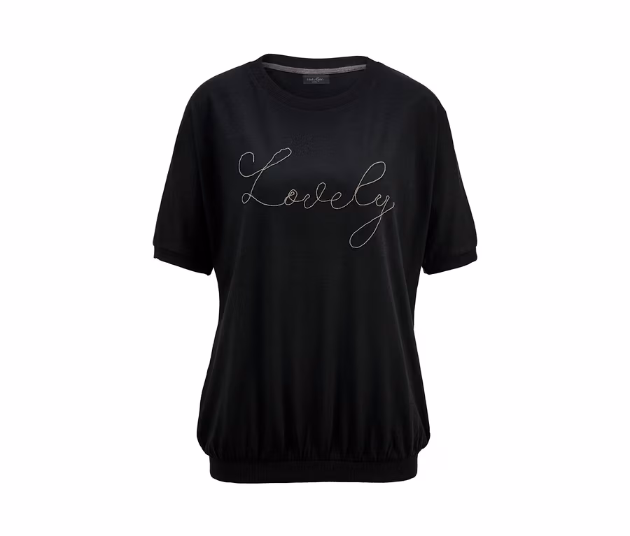 So lovely! Dieses wundervoll fließende Shirt macht seinem »Lovely«-Schriftzug aus einer dekorativen Metallkette alle Ehre. Das Metallplättchen in dekorativem Herz-Design am Saum macht das Gesamtbild perfekt.