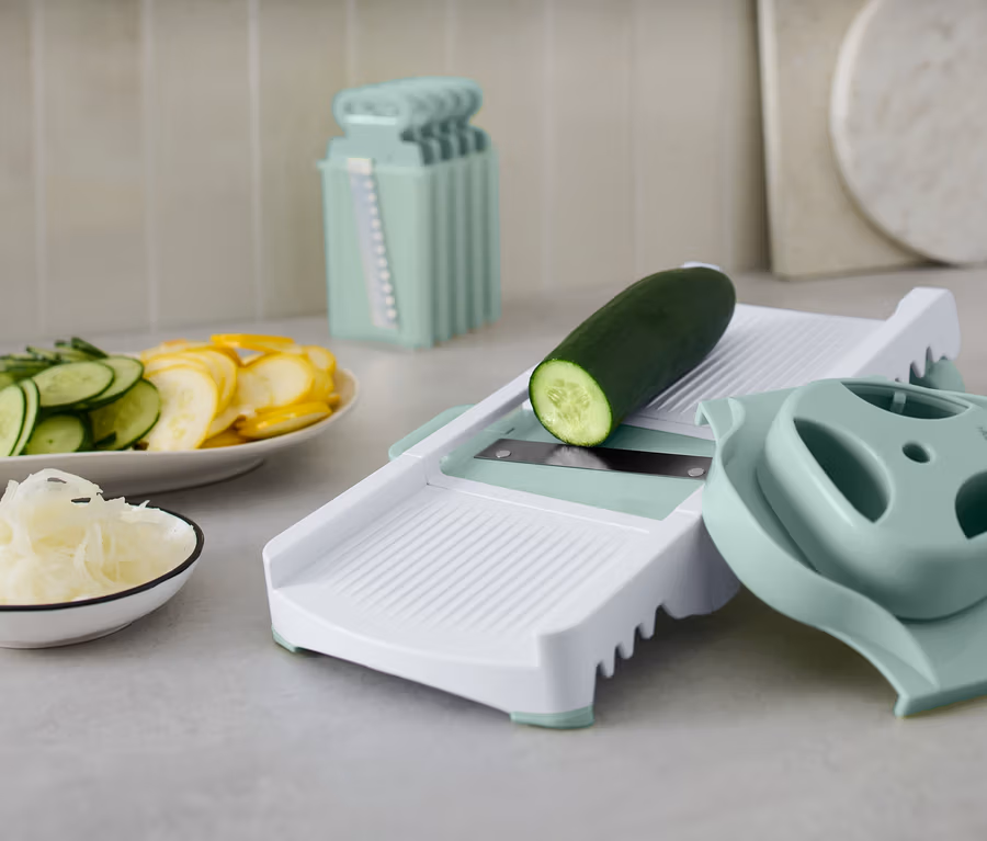 - Grob- und Fein-Raspel, Reibe, Hobel, Julienne- und Rillenschneide-Einsatz mit Aufbewahrungsbox