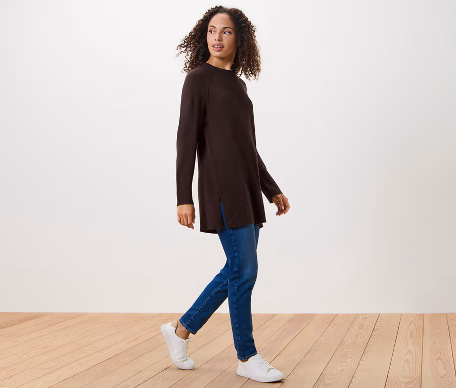 • Hochgeschlossener Rundhalsausschnitt mit Rippbündchen
