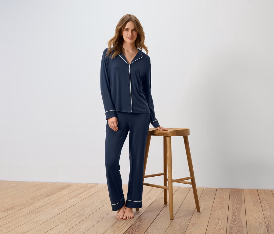 - Dieser Pyjama beinhaltet Fasern aus nachhaltigem Holz.