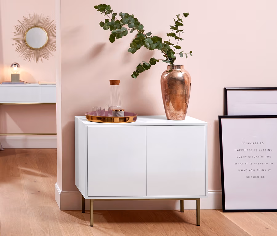 In diesem Sideboard im zeitlosen Design mit eleganter Hochglanzfront verschwinden Bücher, Accessoires oder Ordnungsboxen besonders stilvoll. Hinter der Doppeltür bietet das Ordnungsmöbel mit einem individuell verstellbaren Einlegeboden viel Stauraum und das goldfarbene Untergestell setzt einen edlen, klassisch angehauchten Akzent.