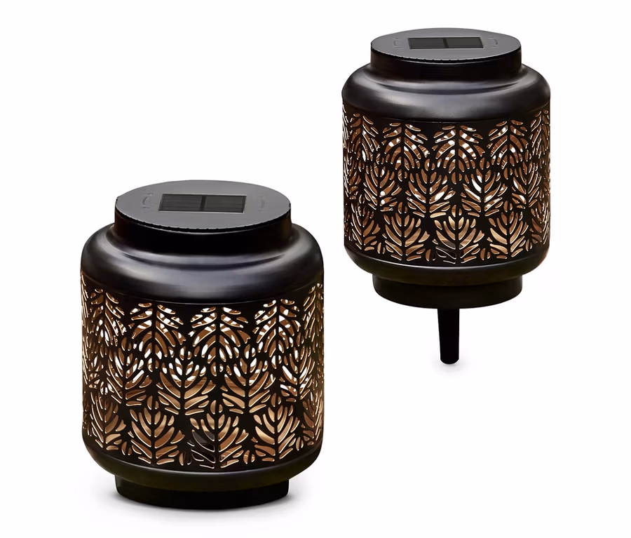 Die schwarzen Outdoor-Leuchten sind an ihrer Innenseite goldfarben lackiert, was im Zusammenspiel mit dem filigranen Muster für schöne Reflexionen und Lichtakzente sorgt. Die fest integrierten LEDs tauchen ihre Umgebung in ein angenehmes, warmweißes Licht und werden über das Solarpanel im Deckel mit Energie versorgt. Die Lampen haben einen Dämmerungssensor, mit dem sie sich bei einbrechender Dunkelheit automatisch einschalten, und mit den Erdspießen lassen sie sich überall im Garten oder in Kübeln fest platzieren.