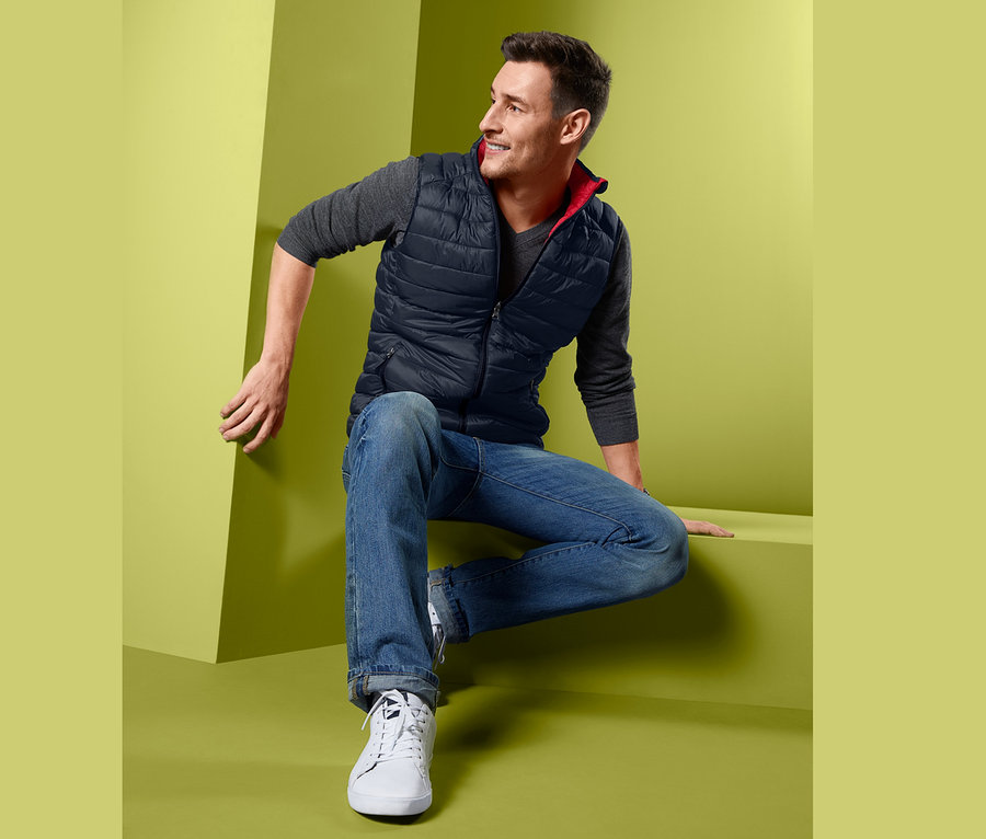 Wenn ein frischer Wind weht oder es in den Abendstunden ein wenig abkühlt, ist die Weste immer noch das ideale Kleidungsstück. So kann man sich mit dieser Wende-Steppweste und ihrer leichten Wattierung warm halten und zusätzlich zwischen ihren beiden Looks wählen. Die Wendeweste ist mit einem Reißverschluss und mit einem hochschließenden Kragen ausgestattet und hat auf ihrer dunkelblauen Seite zwei Reißverschlusstaschen. Auf der roten Seite sind zwei Eingrifftaschen eingearbeitet.