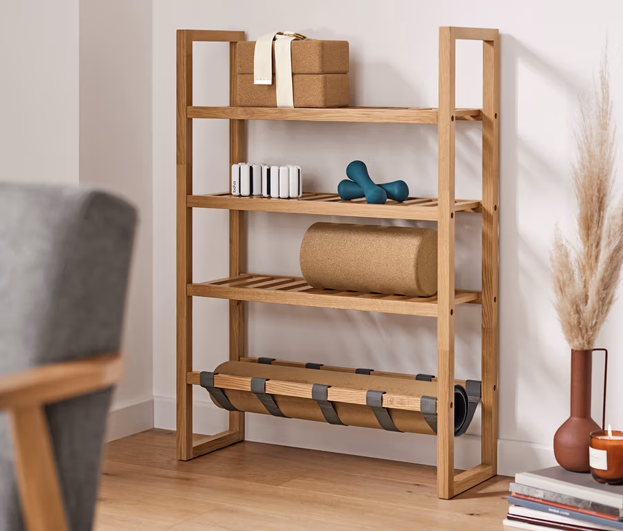 - 3 Ablagen in Lattenoptik und 1 untere Ablage mit 5 Stofflaschen