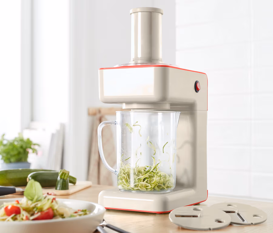 - Inkl. Schüssel, Spiralschneider, Bandschneider, Reibe, Schloss, Kabel und Bedienungsanleitung