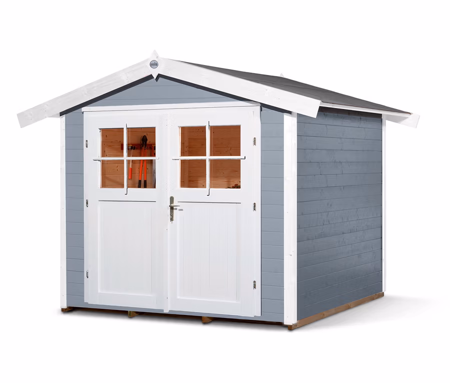 Die Wände haben eine stattliche Stärke von etwa 28 Millimetern und das Massivholzdach mit Bitumenbelag hält den naturbelassenen Innenraum trocken und schattig. Durch die Tür mit einem Durchgangsmaß von etwa 165 auf 172 Zentimetern kommt man auch mit großem Gerät einfach rein oder raus. Bei Bedarf ist ein nachträglicher Einbau von Fenstern möglich.