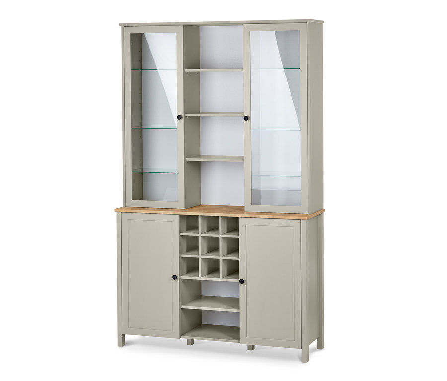 - Individuell anpassbarer Stauraum – hinter den oberen Glastüren jeweils 3 und hinter den unteren Holztüren jeweils 2 höhenverstellbare Böden