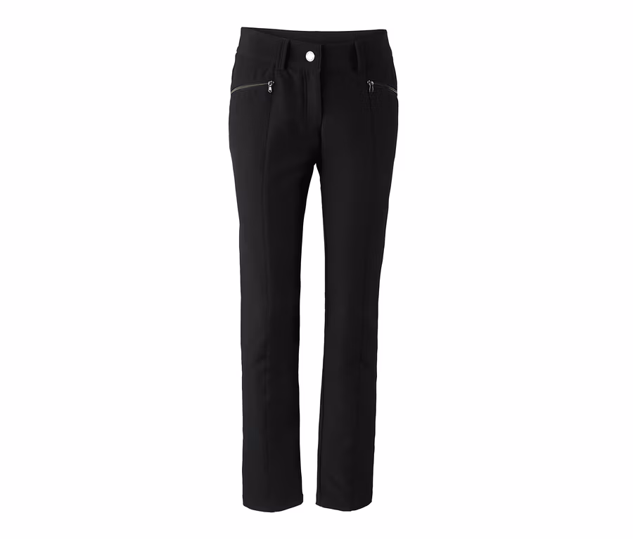 Die Damenhose liegt mit ihrer weich angerauten Innenseite besonders angenehm am Bein und ihr Bund ist zum zusätzlichen Schutz der kälteempfindlichen Partie im Rücken leicht höher geschnitten. An den Seiten hat sie zwei Eingrifftaschen und auf Vorder- und Rückseite sorgen Ziernähte für einen modischen Look.