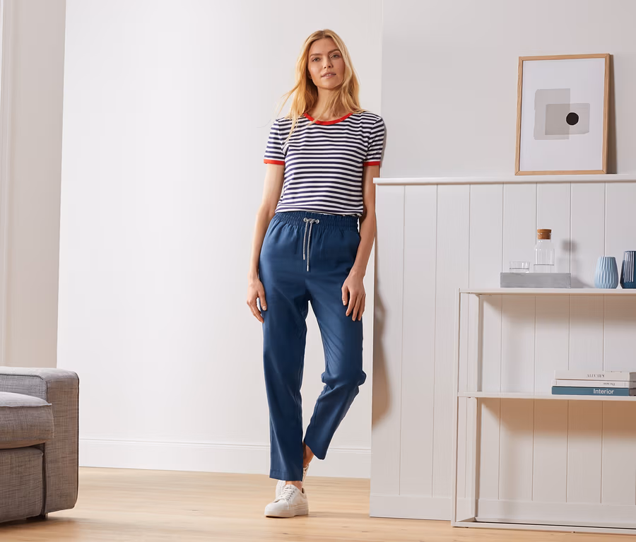 - Leicht geraffter, elastischer Komfortbund mit Tunnelzug