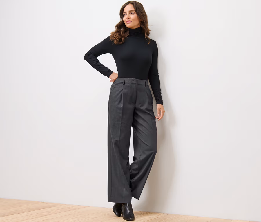 - Elastischer Bund mit Gürtelschlaufen, Reißverschluss, Haken und verdecktem Knopf