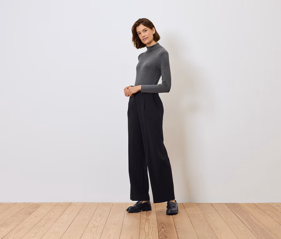 - Elastischer Bund mit Gürtelschlaufen, Reißverschluss, Haken und verdecktem Knopf