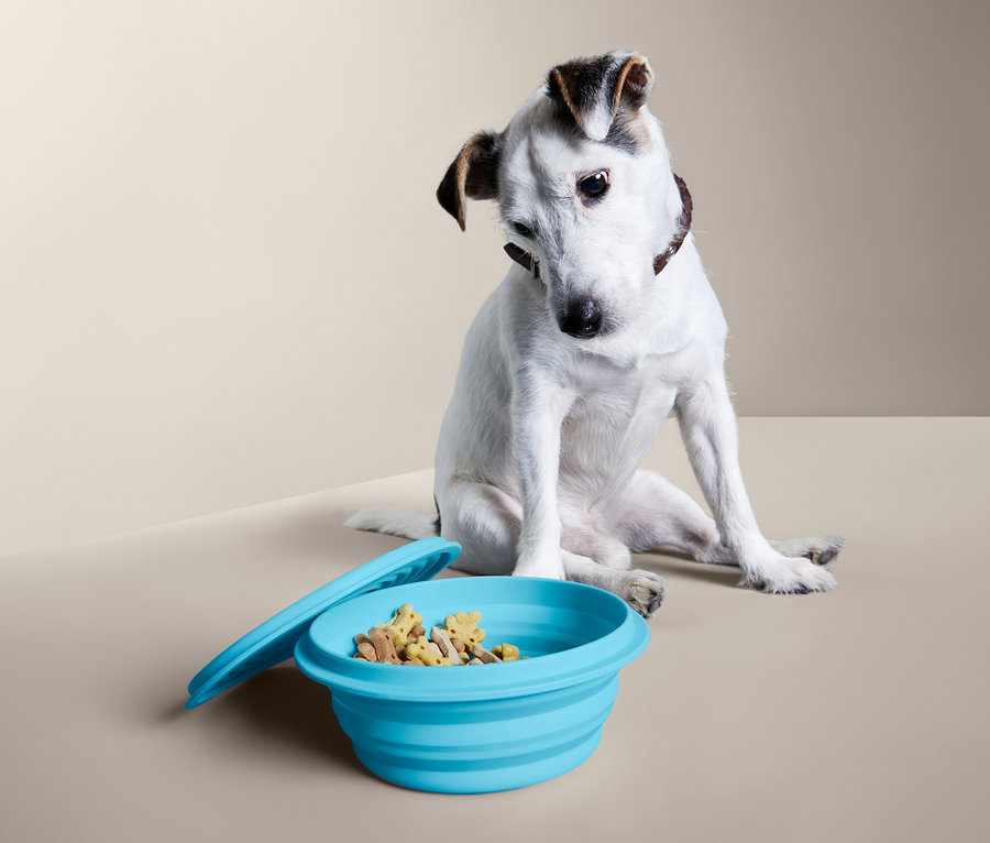 Der Hundenapf fasst circa einen Liter, ist extraleicht und lässt sich durch das flexible Silikon flach zusammenfalten – so passt er in jede Tasche! Für den Snack zwischendurch einfach das Futter für Hund oder Katze in den Behälter füllen, mit dem Deckel verschließen und schon sind Frauchen oder Herrchen immer perfekt ausgerüstet.