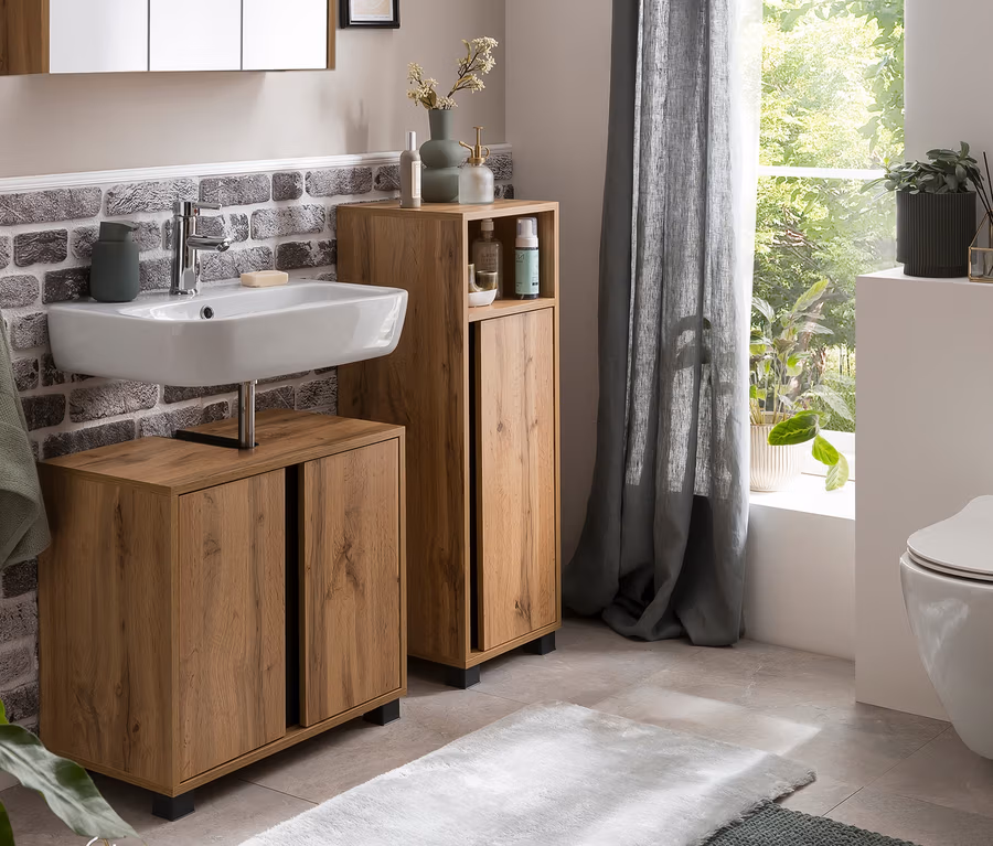 - Eiche-Landhaus-Dekor mit matt-schwarzen Akzenten an Füßen und innenliegender Blende