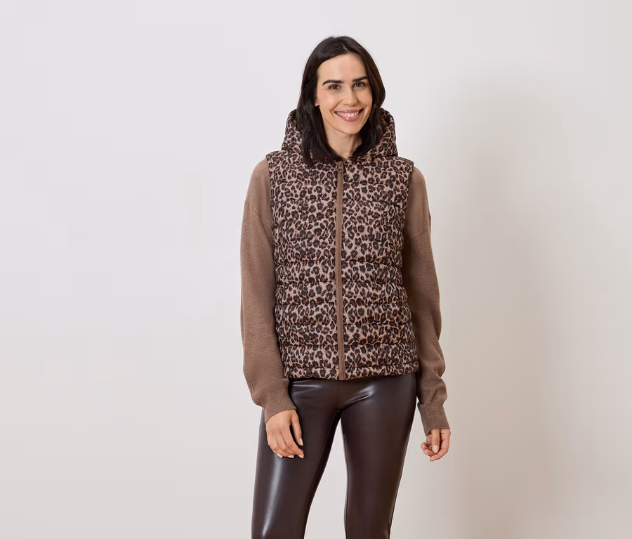 Steppweste mit Kapuze, beige mit braun-schwarzem Leo-Alloverprint