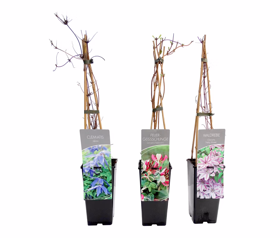 - Inkl. 1 Clematis (alpina), 1 Feuergeißschlinge (Lonicera heckrottii) und 1 Waldrebe (Clematis »Nelly Moser«)
